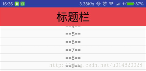 <RelativeLayout xmlns:android="http://schemas.android.com/apk/res/android" android:layout_width="match_parent" android:layout_height="match_parent" android:orientation="vertical"> <ListView android:id="@+id/listvew" android:layout_width="match_parent" android:layout_height="match_parent"/> <!--标题栏,这里简单写个textview--> <TextView android:id="@+id/title_tv" android:layout_width="match_parent" android:layout_height="wrap_content" android:background="#00000000" android:gravity="center" android:orientation="vertical" android:padding="5dp" android:textSize="30sp"/> </RelativeLayout>