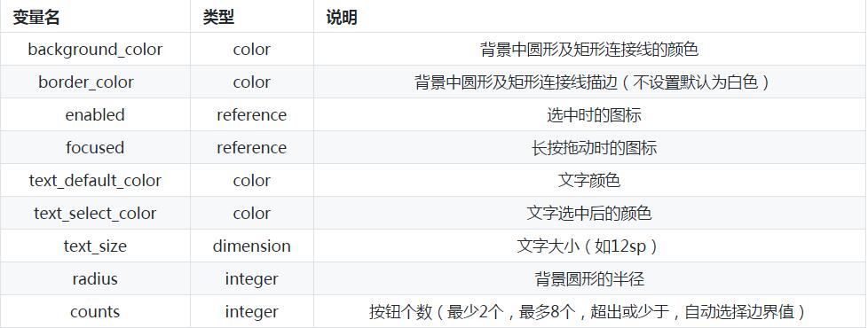 <com.xuezj.dragchooselibrary.view.DragChooseView android:id="@+id/my_view" android:layout_width="wrap_content" android:layout_height="wrap_content" choose:background_color="#efeff4" choose:border_color="#ffcfcfd3" choose:enabled="@mipmap/sliderwifion" choose:focused="@mipmap/sliderwifioff" choose:text_size="12sp" choose:counts="5" choose:radius="20" />