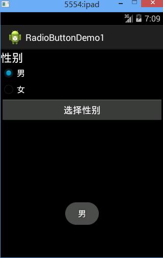 <RadioGroup android:id="@+id/radioGroup1" android:layout_width="match_parent" android:layout_height="wrap_content" > <RadioButton android:layout_width="wrap_content" android:layout_height="wrap_content" android:text="男" android:textColor="#FFFFFF" /> <RadioButton android:layout_width="wrap_content" android:layout_height="wrap_content" android:text="女" android:textColor="#FFFFFF" /> </RadioGroup>