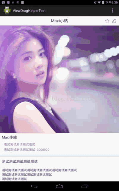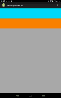 在上面的代码段中我已经做了注释,在clampViewPositionVertical中我们对View的竖直方向活动区域做了限制,防止滑出ViewGroup,当然你可以直接return top;不过为了效果我先这么限定一下。还有一个clampViewPositionHorizontal方法,同样是对其水平边界进行控制的,先不多说啦。这个时候咱们自定义的ViewGroup初期已经完成,先去试试水。