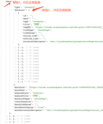 所以,我们需要的数据结构也就确定了,应该是数组套数组,也就说护肤大分类下又有子分类商品,类似于这个样子: