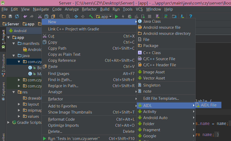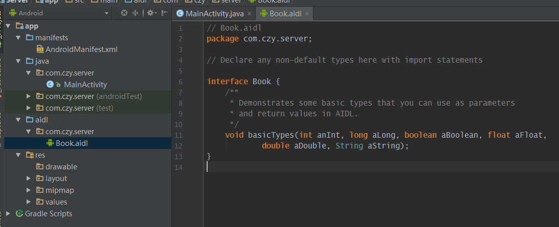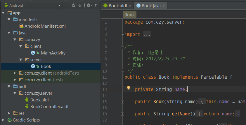首先,需要把服务端的AIDL文件以及Book类复制过来,将 aidl 文件夹整个复制到和Java文件夹同个层级下,不需要改动任何代码
