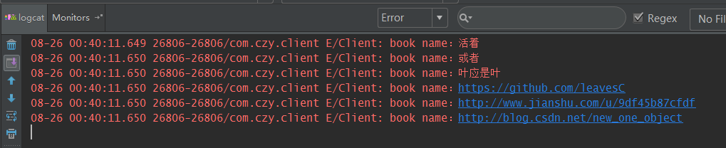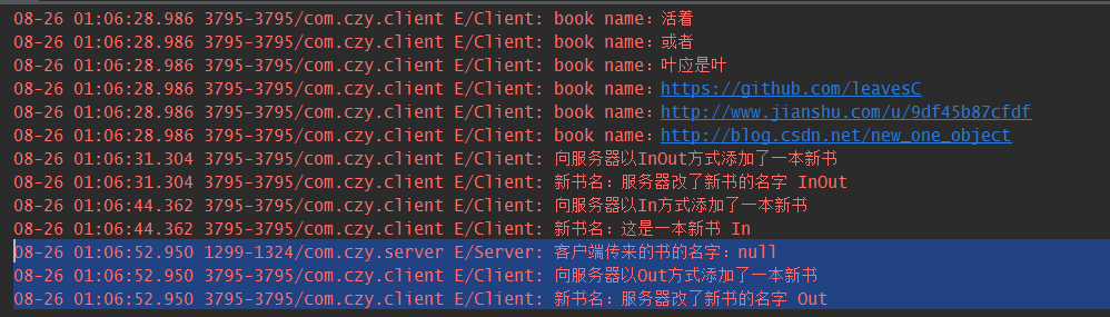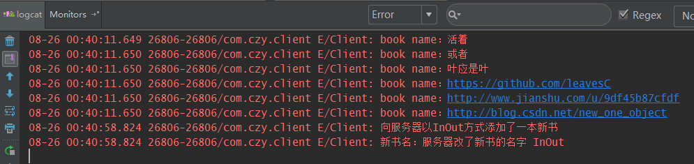 Log.e(TAG, "客户端传来的书的名字:" + book.getName());