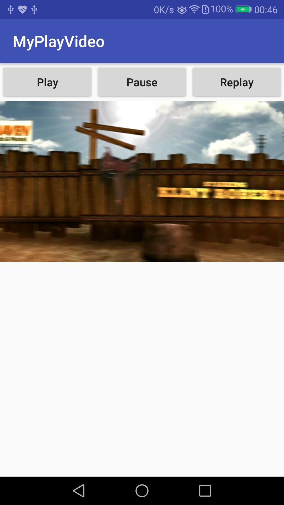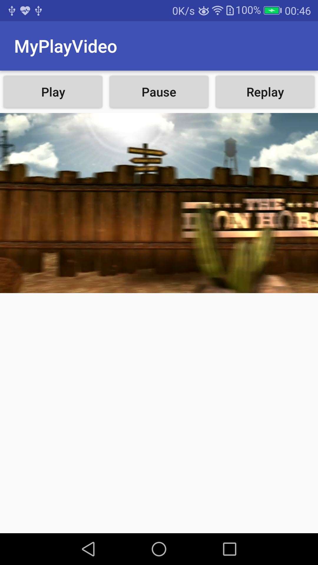<?xml version="1.0" encoding="utf-8"?> <LinearLayout xmlns:android="http://schemas.android.com/apk/res/android" xmlns:tools="http://schemas.android.com/tools" android:layout_width="match_parent" android:layout_height="match_parent" android:orientation="vertical" tools:context="com.cofox.myplayvideo.MainActivity"> <LinearLayout android:layout_width="match_parent" android:layout_height="wrap_content" android:orientation="horizontal"> <Button android:id="@+id/btnPlay" android:layout_width="0dp" android:layout_height="wrap_content" android:layout_weight="1" android:text="Play" android:textAllCaps="false" /> <Button android:id="@+id/btnPause" android:layout_width="0dp" android:layout_height="wrap_content" android:layout_weight="1" android:text="Pause" android:textAllCaps="false" /> <Button android:id="@+id/btnReplay" android:layout_width="0dp" android:layout_height="wrap_content" android:layout_weight="1" android:text="Replay" android:textAllCaps="false" /> </LinearLayout> <VideoView android:id="@+id/vdvwFilm" android:layout_width="match_parent" android:layout_height="wrap_content" /> </LinearLayout>