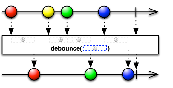debounce原理类似于我们在收到请求之后,发送一个延时消息给下游,如果在这段延时时间内没有收到新的请求,那么下游就会收到该消息;而如果在这段延时时间内收到来新的请求,那么就会取消之前的消息,并重新发送一个新的延时消息,以此类推。