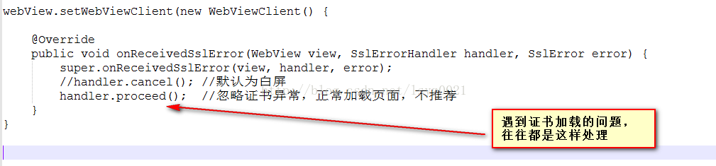 handler.cancel() 就是让加载的页面白屏,所有导致了如果webview校验证书存在异常,android在默认情况下会显示白屏,我们也可调用handler.proceed(),大多时候很多人都是这个处理,但是这也就意味着https证书失去了他存在的意义了。