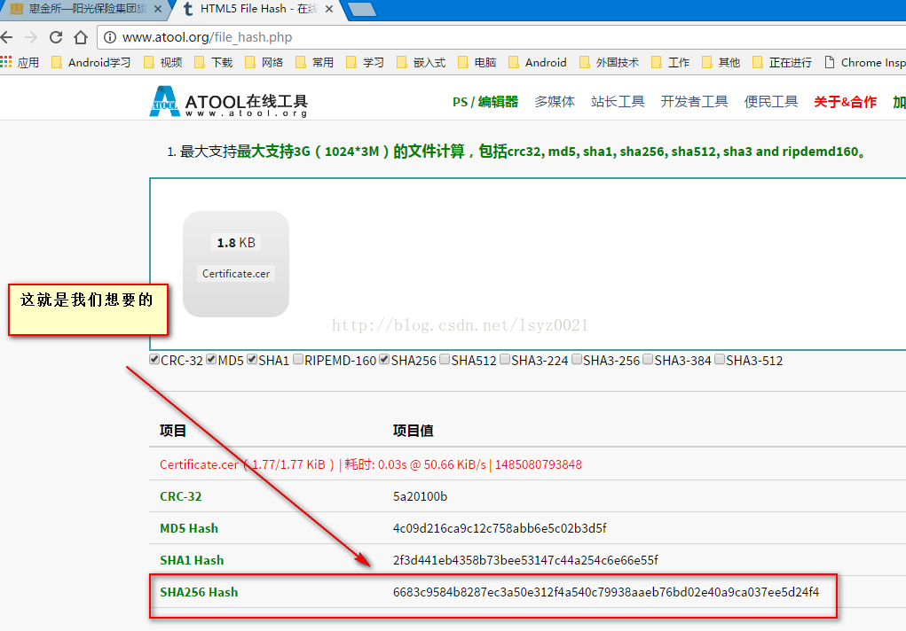 然后在打开sha256校验网址:http://www.atool.org/file_hash.php