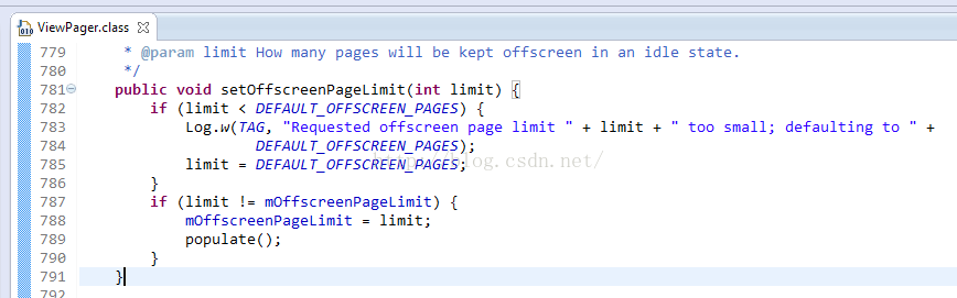 DEFAULT_OFFSCREEN_PAGES 这里就定义了默认值是1, 所以网上 有种解决方案 说调用ViewPager的setOffscreenPageLimit(int limit),来设置ViewPager预加载的数量,但是这里很明确的告诉你,这种方案是不可行的,如下图ViewPager源码: