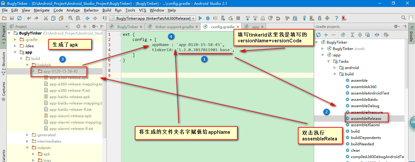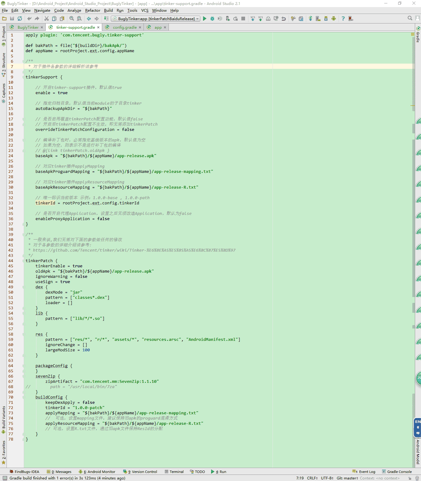 至于如何使用Bugly热更新看文档就可以了,今天我就说一说官网文档中多渠道补丁的一些错误(今天以Bugly1.2.2(tinker1.7.6))为例