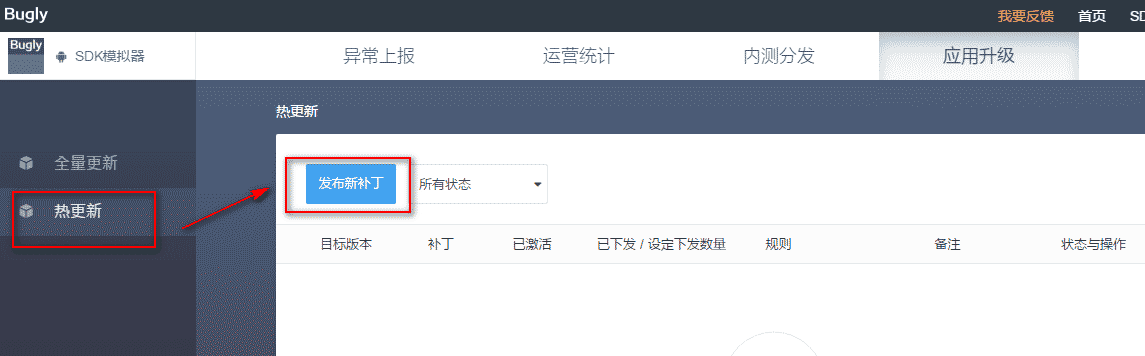 生成完补丁包后,就可以借助Bugly的热更新进行修复了,找到我们注册的app,上传补丁包