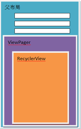 而图中的父布局和RecyclerView隔着一个ViewPager,也就是说NestedScrollingParent的ChildView是ViewPager,NestedScrollingChild的ViewGroup是ViewPager。所以说直接嵌套一层ViewPager的情况是无法解决滑动冲突的。