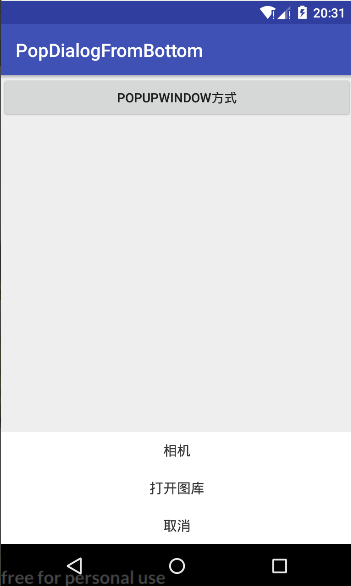 因为本文主要是介绍实现底部弹窗的方式,所以,不会对PopupWindow进行具体的讲解,大家可以到这里了解PopupWindow。