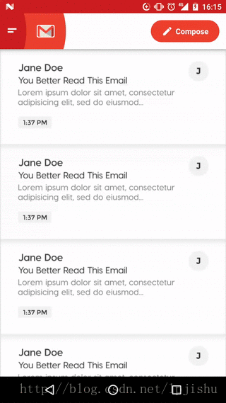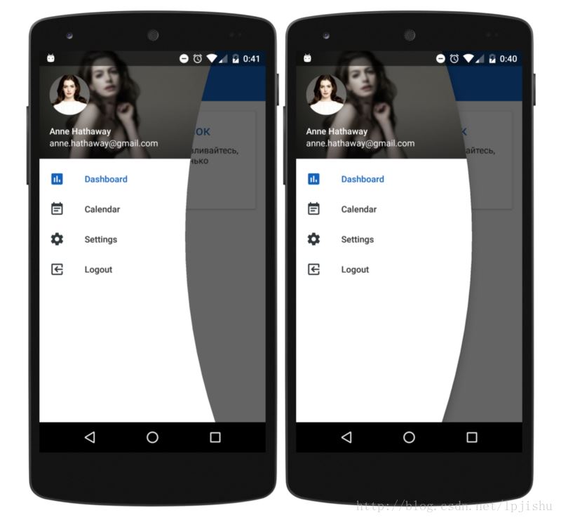 这是Florent Champigny的另一个伟大实现。 灵感来自于DrawerLayout的顶级酒吧(从ActionBar / Toolbar实现中知道)的设计是一种新的方法。它的工作原理如下: