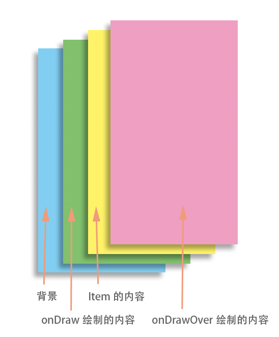 RecyclerView 的背景、onDraw绘制的内容、Item、onDrawOver绘制的内容,各层级关系如下: