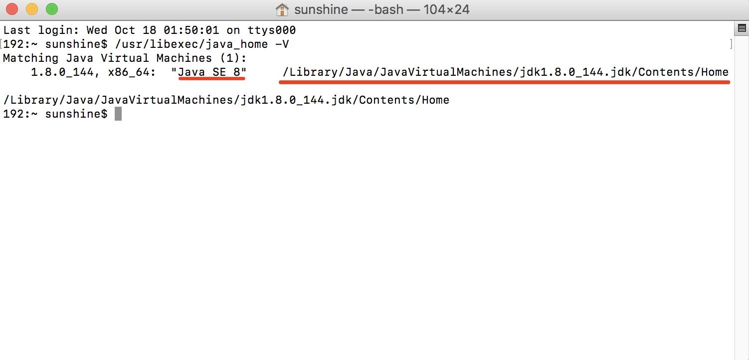 JAVA_HOME=/Library/Java/JavaVirtualMachines/jdk1.8.0_144.jdk/Contents/Home PATH=$JAVA_HOME/bin:$PATH:. CLASSPATH=$JAVA_HOME/lib/tools.jar:$JAVA_HOME/lib/dt.jar:. export JAVA_HOME export PATH export CLASSPATH