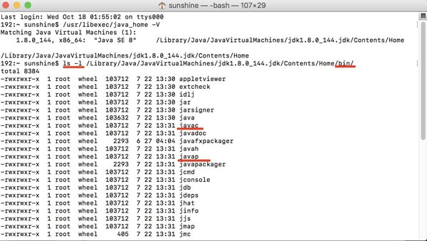 执行命令:ls -l /Library/Java/JavaVirtualMachines/jdk1.8.0_144.jdk/Contents/Home/bin/