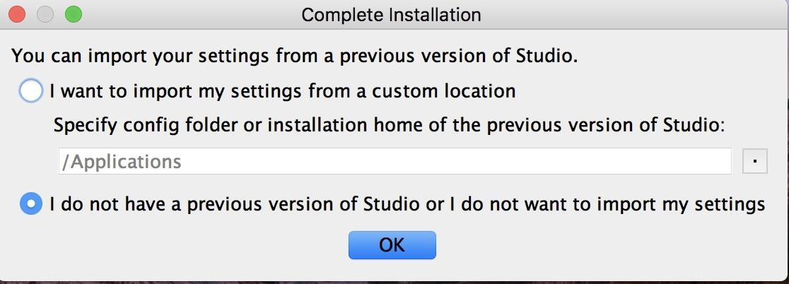 因为我是第一次用mac本安装AS,曾经wins的设置不能导入,所以这里我选择第二项。点击“OK”按钮。
