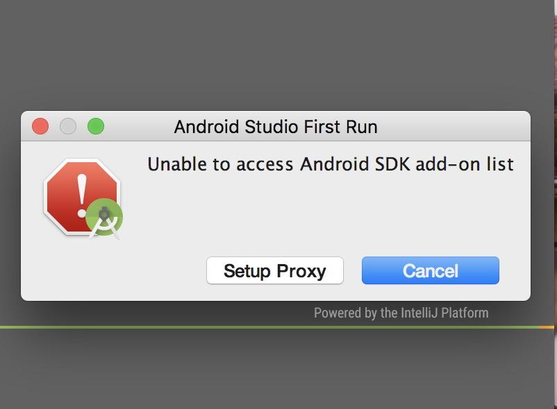 弹窗英文翻译:“无法访问Android SDK附加组件列表”。