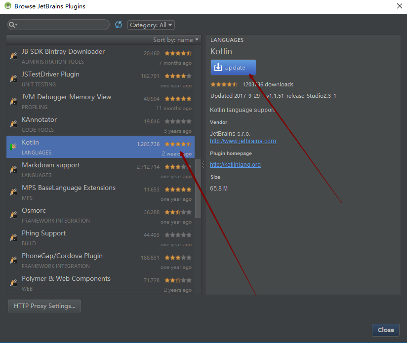 在线安装步骤:File—>Settings—>Plugins—>Install JetBrains plugin…出现以下界面,选中Kotlin 点击右边的Install(因为我的已经安装了所以显示的是Update升级)