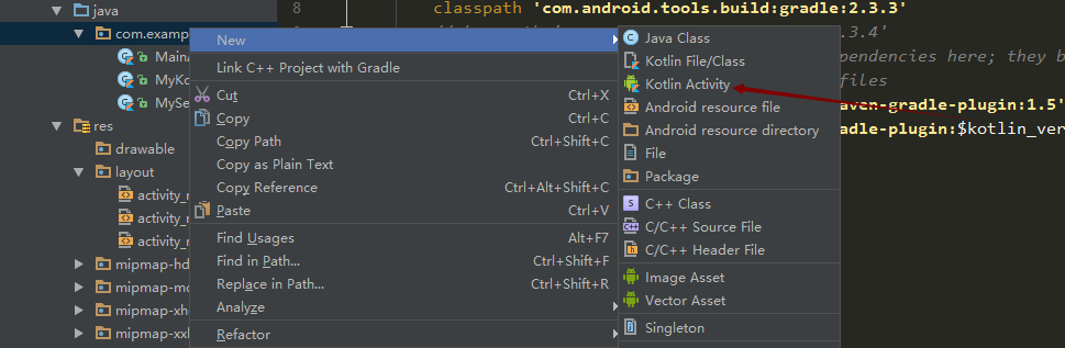 第三步:开发第一个Kotlin项目,首先要创建一个KotlinActivity