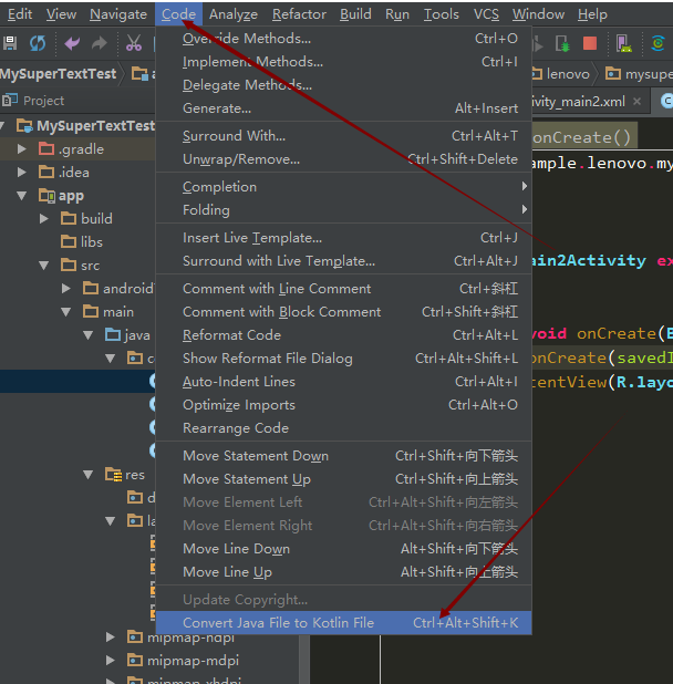 补充一点:将原来的java文件转换为Kotlin文件,选中你的java文件,如下图操作: