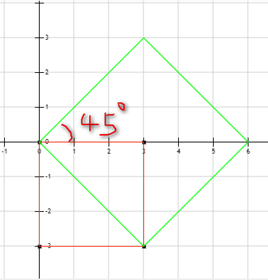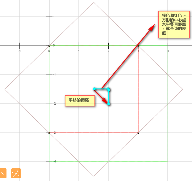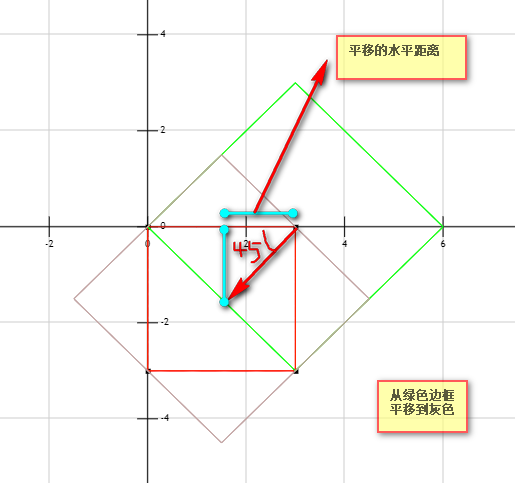 从上图我们可以看出,我们需要旋转45度然后平移回来,平移的距离,从下图可以分析出为两边的差值。