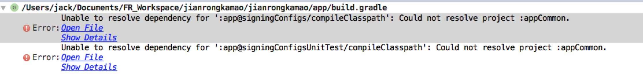 第一眼看这个错的时候我以为我setting.gradle中没有依赖appCommon,看完之后明明确实依赖了,而且这是一个老项目,在AS2.3版本的时候很正常,然后我就知道这又是一个坑,无奈的又去上了一把Internet,然后试过网上说的在buildTypes中加入preview节点,然而并没有什么卵用,查了半天还是没有找到解决的方法,后来看着这段报错信息的时候,我看到了signingConfigs,我想到gradle中好像有这么个节点,抱着试一试的态度我删了那个节点,然后,卧槽卧槽卧槽,可以成功编译了,这是不是有一种躺着过坑的赶脚。如果有其他更好的解决方法,欢迎私信我,有偿给发红包