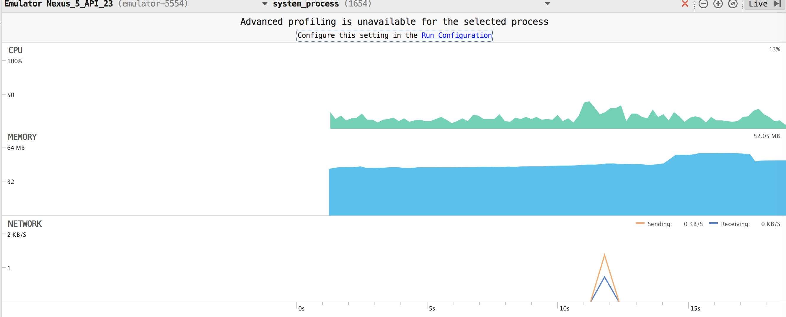 在手机上发起一次网络请求,NETWORK那一栏会发生明显的变化,我们选择那个区域进行抓包,可以看到请求了一个接口MainServlet(如果该区域下会请求多个接口,则会一一列出来),然后我们点击MainServlet,就会出现后台传过来的Json,Header之类的信息,怎么样,是不是很屌,以后再也不用再麻烦测试帮你抓包了,也不用再装什么其他软件了。CPU和MEMORY也一样,都具有记录当前页面的数据,你也可以根据它所记录的数据进行相应的分析。这两个就不展示了,有兴趣的同学可以更新之后自己玩玩。最后需要注意的是开启这个之后会降低应用程序的构建速度,因此只有在你要开始对应用程序进行概要分析时,再启用它。