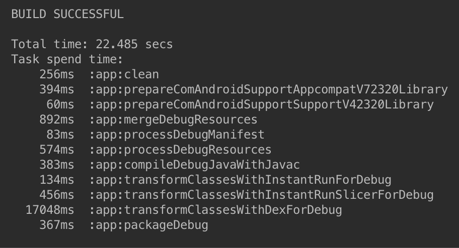 完成后打包发布到jcenter()。之后你只要引用了该插件,就会统计各个task执行的时间,比如运行app,就会输出像下面的信息。