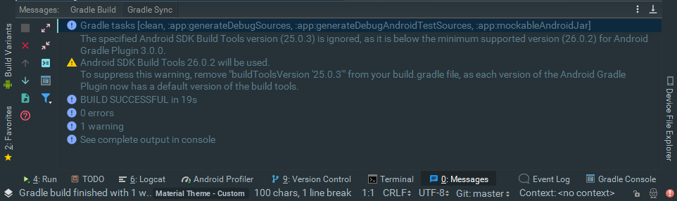 又来一个警告,大概意思是说,你的gradle版本已经升级到3.0了,需要和26.0.2版本的构建工具搭配才更好,好好好,听你的: