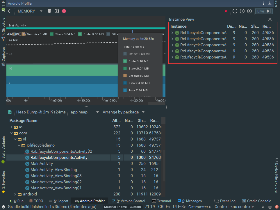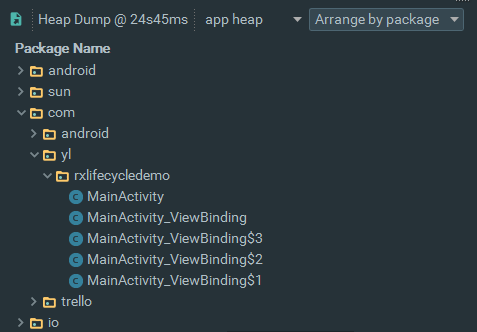 反复打开页面5次,手动GC,看下当前的堆栈情况,可以看到当前已经没有RxLifecycleComponentsActivity的实例存在了: