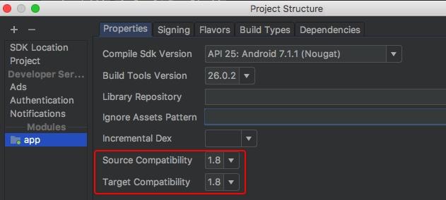 可在Android Studio工具栏,File -> Project Structure,修改Source Compatibility和Target Compatibility为1.8。