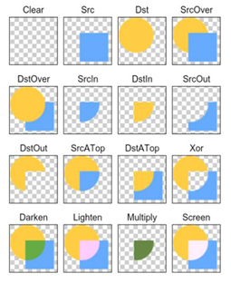 关于 PorterDuff.Mode 的值,确定了 SrcBmp 和 DstBmp 交叠时像素的处理方式,其作用用一幅图片展示如下: