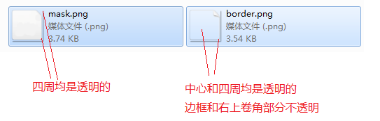 这时候,我们可以用两张辅助图来实现这个效果,一张底图做掩码,得到 “圆角+左上角切角” 的效果,然后用另一张图片覆盖在上面,得到 “灰色边框+右上角卷角” 的效果,我们需要的两张图如下: