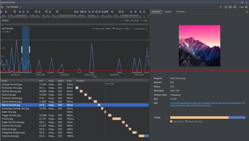 这三个工具在开发阶段非常实用,比如 CPU Profiler 能够分析应用中的线程使用情况,Memory Profiler 能够检测出内存泄漏,Network Profiler 能够拦截网络请求实现抓包功能等。这里列举一些使用图片,简单预览一下这三大工具的风采: