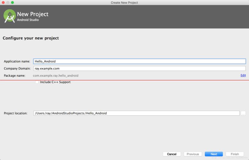 出现新建项目对话框,给app取名为Hello_Android,接下来几步都是默认设置即可