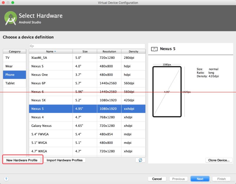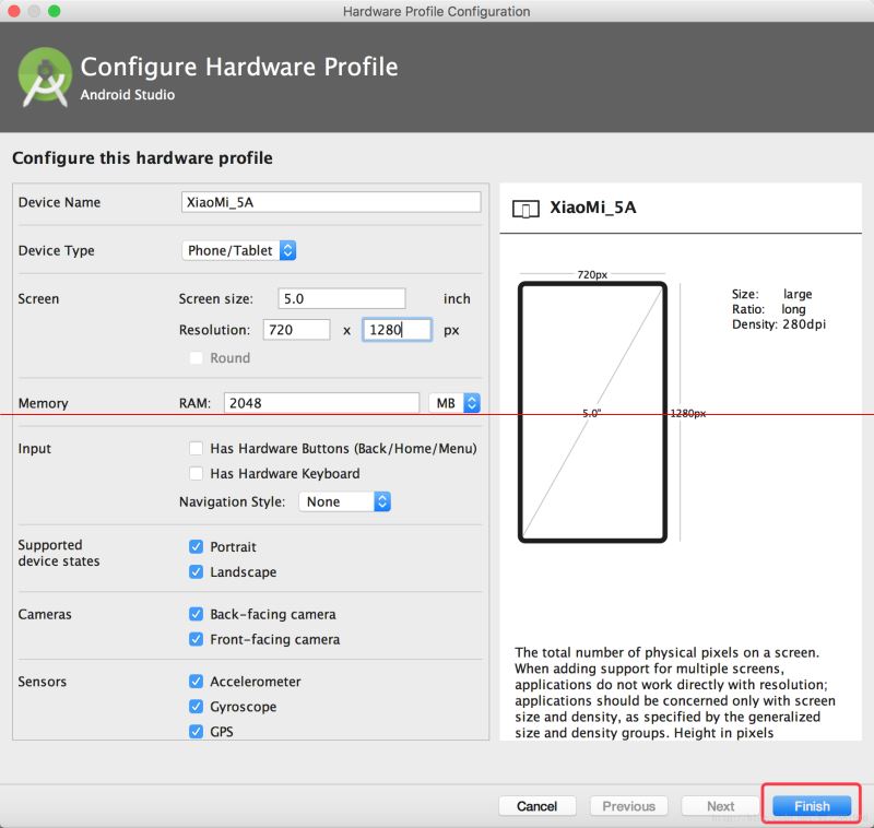 笔者买的是红米5A,2G运行内存、5寸屏幕、1280*720分辨率。因为默认的内置仿真器没有这种参数的,所以下面先新建一个这种参数规格的设置: