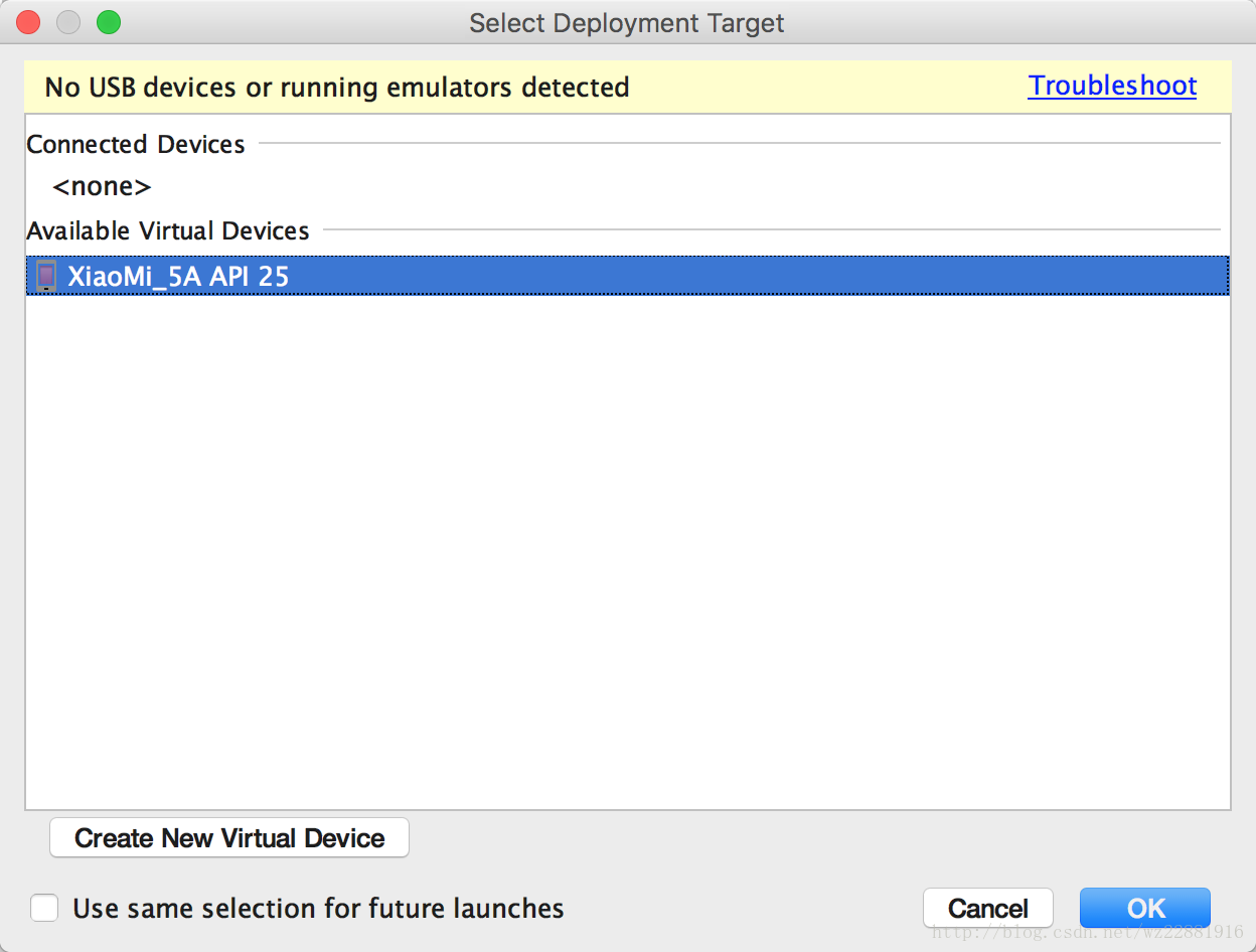 在Android Studio中点击绿色运行箭头,如下图选择手机,就可以真机调试了