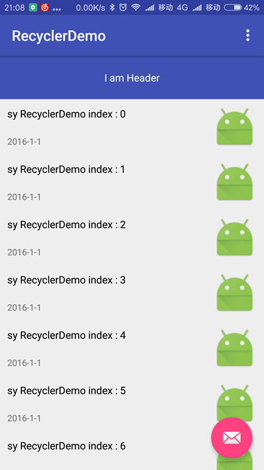 getItemViewType方法是在执行onCreateViewHolder(ViewGroup parent, int viewType)前回调用viewType,目的是为了根据viewType不同创建不同的视图。我们可以通过在onCreateViewHolder创建视图的时候,对viewType进行判断,如果添加了头部,在position = 0的时候回调头部的viewType给onCreateViewHolder,从而创建头部。尾部创建方法于此类同,直接看下代码,适配器的实现: