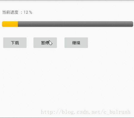 <?xml version="1.0" encoding="utf-8"?> <RelativeLayout xmlns:android="http://schemas.android.com/apk/res/android" xmlns:tools="http://schemas.android.com/tools" android:id="@+id/activity_main" android:layout_width="match_parent" android:layout_height="match_parent" android:paddingBottom="@dimen/activity_vertical_margin" android:paddingLeft="@dimen/activity_horizontal_margin" android:paddingRight="@dimen/activity_horizontal_margin" android:paddingTop="@dimen/activity_vertical_margin"> <TextView android:text="下载进度" android:layout_width="wrap_content" android:layout_height="wrap_content" android:layout_alignParentTop="true" android:layout_alignParentLeft="true" android:layout_alignParentStart="true" android:layout_marginTop="15dp" android:id="@+id/tv_progress" /> <Button android:text="下载" android:layout_width="wrap_content" android:layout_height="wrap_content" android:layout_below="@+id/firstBar" android:layout_alignParentLeft="true" android:layout_alignParentStart="true" android:layout_marginTop="29dp" android:id="@+id/bt" /> <Button android:text="暂停" android:layout_width="wrap_content" android:layout_height="wrap_content" android:layout_alignTop="@+id/bt" android:layout_toRightOf="@+id/bt" android:layout_toEndOf="@+id/bt" android:layout_marginLeft="15dp" android:layout_marginStart="15dp" android:id="@+id/bt_pause" /> <Button android:text="继续" android:layout_width="wrap_content" android:layout_height="wrap_content" android:layout_alignBottom="@+id/bt_pause" android:layout_toRightOf="@+id/bt_pause" android:layout_toEndOf="@+id/bt_pause" android:layout_marginLeft="18dp" android:layout_marginStart="18dp" android:id="@+id/bt_start" /> <ProgressBar android:id="@+id/firstBar" android:layout_width="fill_parent" android:layout_height="wrap_content" style="@android:style/Widget.ProgressBar.Horizontal" android:layout_below="@+id/tv_progress" android:layout_alignParentLeft="true" android:layout_alignParentStart="true" android:layout_marginTop="21dp" /> </RelativeLayout>