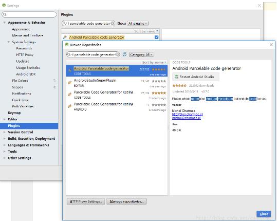 在File->Setting->Plugins里的搜索框内输入内容:android parcelable code generator,然后自己下载好重启studio即可使用该插件了。