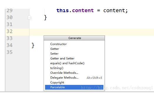 点击右键弹出提示框,选择Parcelable生成即可: