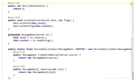 最后是自动生成的代码,也表示成功的实现了Parcelable接口: