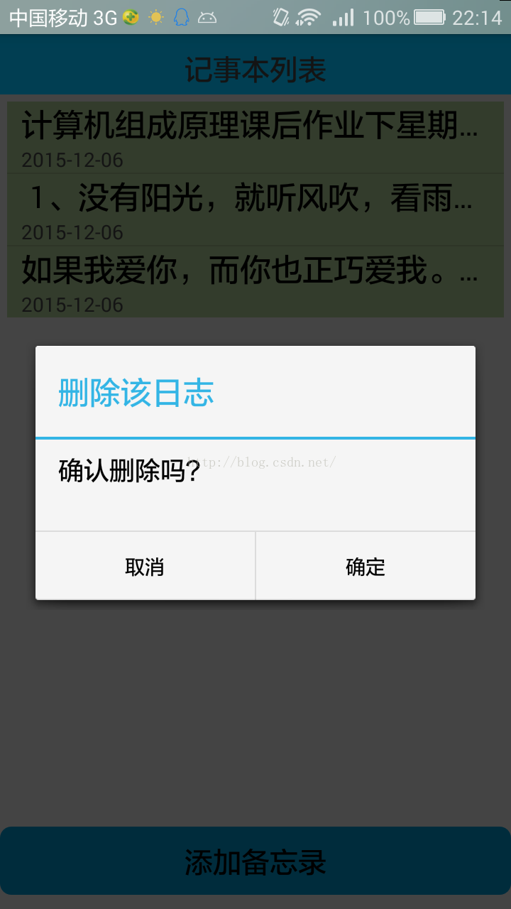五、实现点击添加事件的跳转,在第一个页面中点击添加备忘录后会跳转到第二个界面,设置点击事件,由一个activity跳转到另外一个activity,我使用的是intent方式。另外,在ListView中点击每个已记录下来的日志也会跳转到第二个界面,只是显示的不是空白的EditText,而是包含日志的EditText。MainActivity如下: