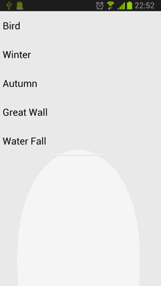 可以看到,我们在activity_main.xml中放入了一个ListView,用于显示图片名称列表。然后又加入了一个ImageView,用于展示图片,不过一开始将ImageView设置为不可见,因为稍后要通过中轴旋转的方式让图片显示出来。