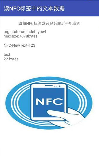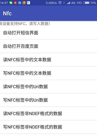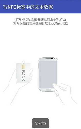 点击写 NFC 标签中的文本数据,跳转到对应的 Activity,将 NFC 标签卡贴近手机,写入成功后会提示,再退回主页面,选择读文本数据,便可读取。