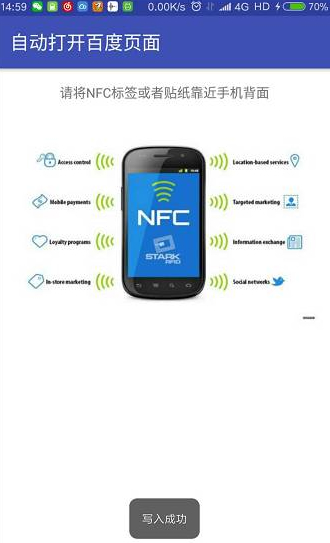 点击自动打开短信界面或百度页面,进入对应 Activity,将 NFC 标签贴近手机背面,提示写入成功。返回主界面,再将 NFC 标签贴近手机背面,便能看到自动打开短信或者打开百度页面。