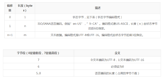 不管什么格式的数据本质上都是由一些字节组成的。对于NDEF文本格式来说,这些数据的第1个字节描述了数据的状态,然后若干个字节描述文本的语言编码,最后剩余字节表示文本数据。这些数据格式由NFC Forum的相关规范定义,可以通过 http://members.nfc-forum.org/specs/spec_dashboard 下载相关的规范。
