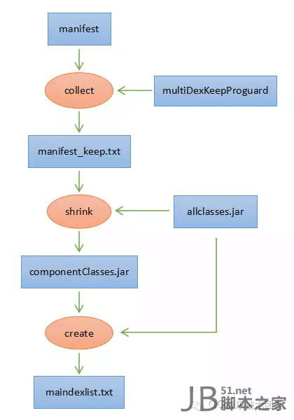 如果项目涉及分dex,那在调用dx命令前,需要做一些准备的工作,把编译后的class文件打包成jar包allclasses.jar,然后生成主dex中必须包含的文件列表。主要包括collect、shrink及create 3个步骤。