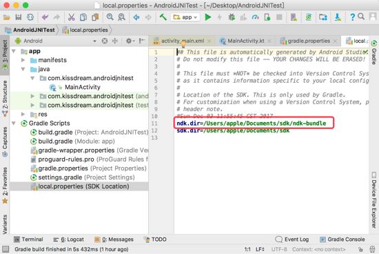 Error:Execution failed for task ':app:compileDebugNdk'. > Error: Flag android.useDeprecatedNdk is no longer supported and will be removed in the next version of Android Studio. Please switch to a supported build system. Consider using CMake or ndk-build integration. For more information, go to: https://d.android.com/r/studio-ui/add-native-code.html#ndkCompile To get started, you can use the sample ndk-build script the Android plugin generated for you at: /Users/apple/Desktop/AndroidJNITest/app/build/intermediates/ndk/debug/Android.mk Alternatively, you can use the experimental plugin: https://developer.android.com/r/tools/experimental-plugin.html To continue using the deprecated NDK compile for another 60 days, set android.deprecatedNdkCompileLease=1512283120054 in gradle.properties